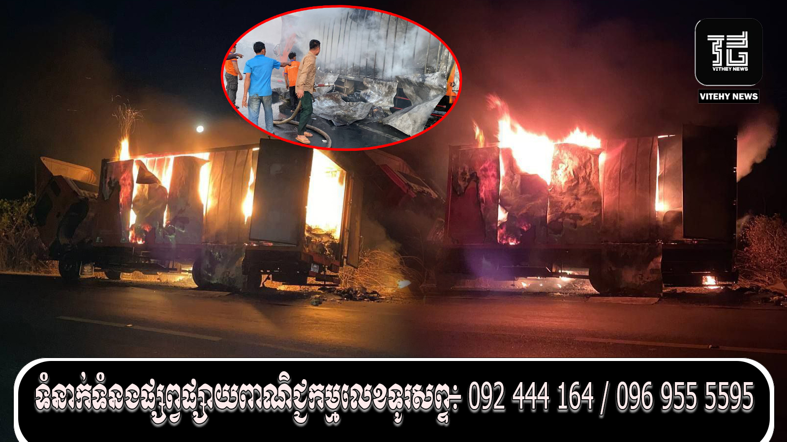 ខេត្តព្រះសីហនុ ៖ មានករណីឆេះរថយន្តដឹកអីវ៉ាន់បញ្ញើមួយគ្រឿងទាំងស្រុង របស់ក្រុមហ៊ុន វី រៈប៊ុនថាំ ទិសដៅពីភ្នំពេញ មកខេត្តព្រះសីហនុ នៅវេលាម៉ោងជាង ២រំលងអាធ្រាត ឈាន ចូលថ្ងៃទី១០ ខែកុម្ភៈ ឆ្នាំ២០២៥ នៅចំណុចភូមិ ស្ទឹងសំរោង ឃុំអូរបាក់រទេះ ស្រុកកំពង់សិលា ខេត្តព្រះសីហនុ។