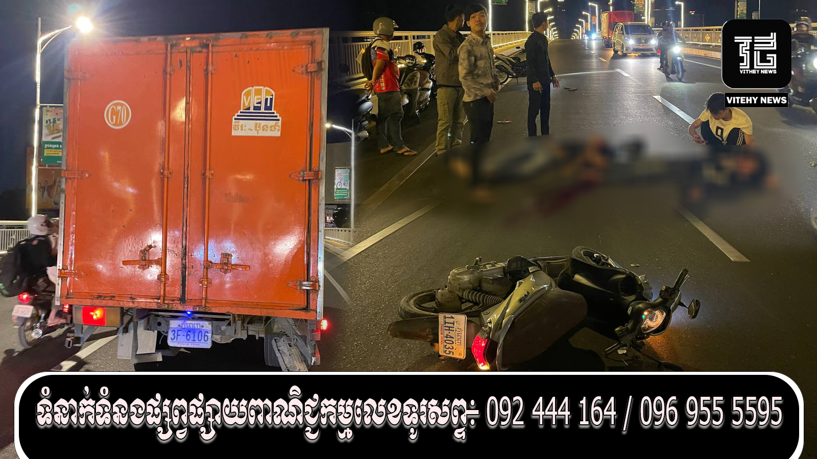 យុវជន២នាក់ជិះម៉ូតូឌុបគ្នាទៅបុកគូទរថយន្តដឹកទំនិញរបស់ក្រុមហ៊ុនវីរៈ ប៊ុនថាំ របួសយ៉ាងធ្ងន់ធ្ងរទាំង២នាក់