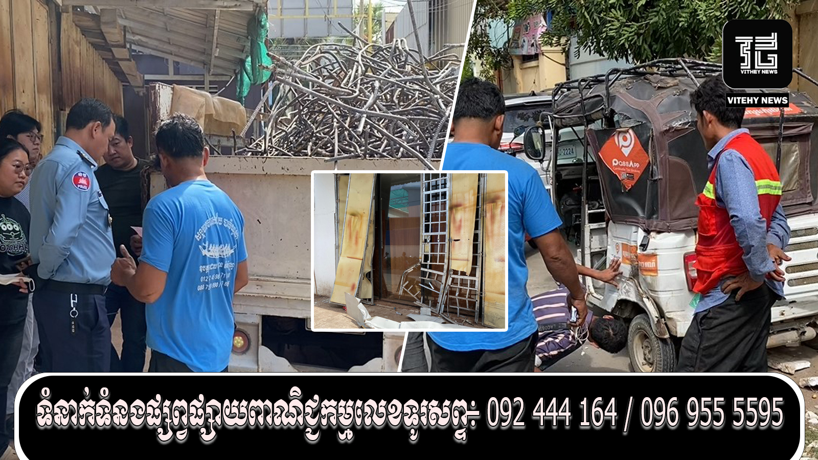 រថយន្តដឹកដែកសសៃអេតចាយ បើកឡើងទួលក្លោងទ្វារវត្តដំបូកខ្ពស់ អកហ្សឺជាមួយរថយន្តពេទ្យ រអិលថយក្រោយ បោលបុករះកង់បីមួយគ្រឿង បន្តបុកចំទ្វារផ្ទះប្រជាពលរដ្ឋបន្ថែម!